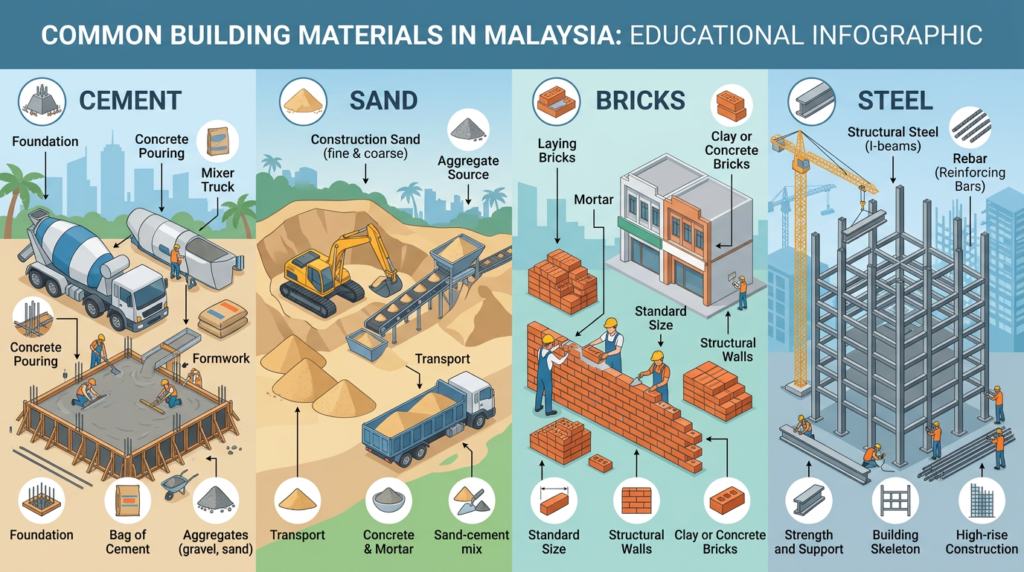 Building a house or commercial project in Malaysia starts with understanding the basic building materials used on almost every site. This guide explains the key materials—cement, sand, bricks, and steel—so that homeowners, students, and new contractors can better understand what they are paying for and how each material affects quality, cost, and durability.